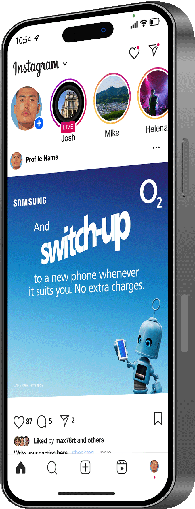 Bubl lifts the O2 logo off blue to reveal the Z Flip 4 lockup in black and white. Push through zooms glide past each copy block, exiting frame to trigger the next headline, price and spec for a continuous flow. Grid snap, safe type zones and ratio maps keep layouts true across 16x9, 1x1 and 9x16. The sequence settles on an O2 Virgin Media co brand endframe with a clear read.